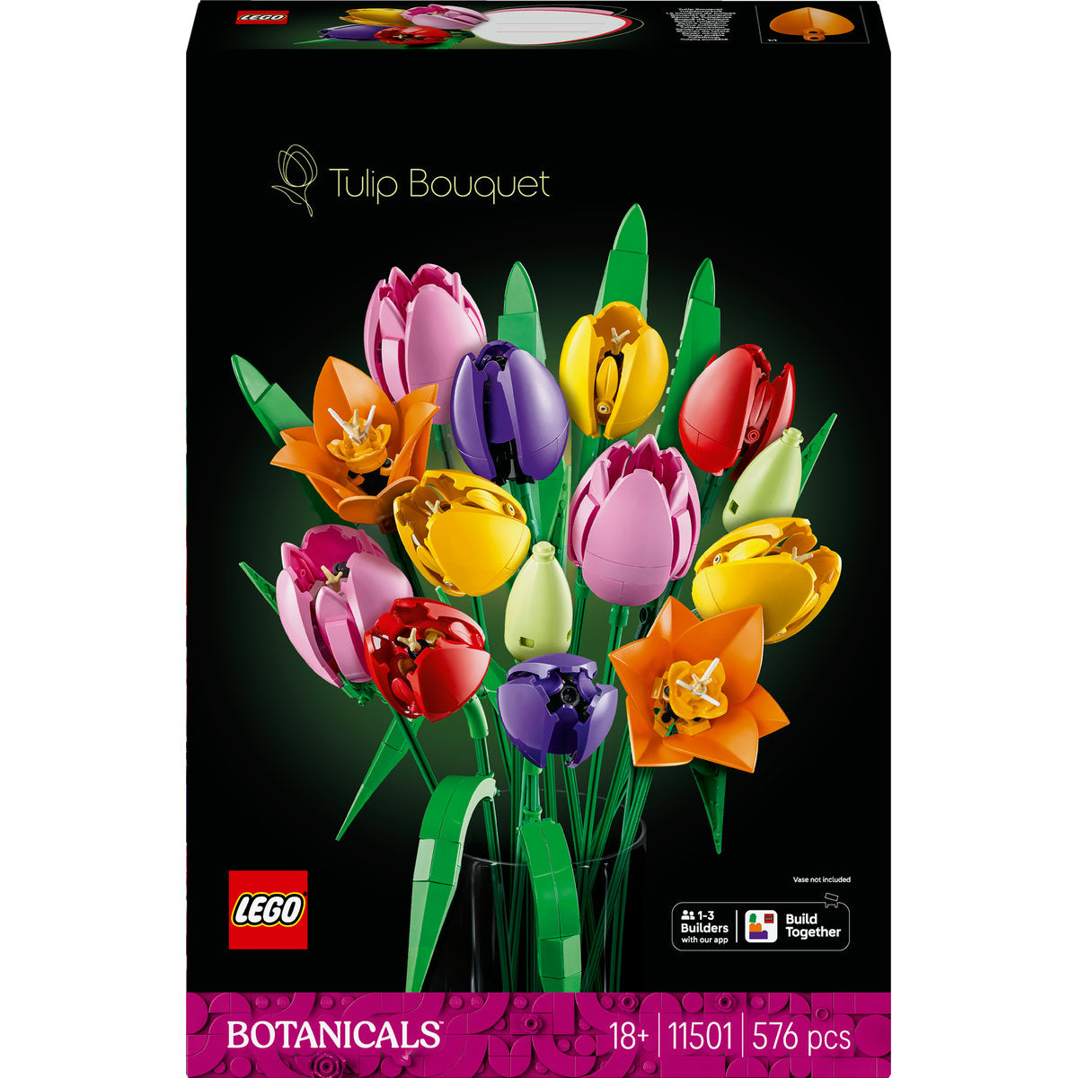 Почувствайте, че креативността процъфтява, докато създавате цветен букет лалета LEGO®. Постройте всеки цвят и се възхищавайте на автентичните детайли и цветове – ще откриете ярки зелени пъпки, лилави затворени лалета и червени, жълти и розови отворени лалета, плюс зелени листа и регулируеми стебла за персонализиране. След като приключите с построяването, покажете букета гордо като декорация с цветя.