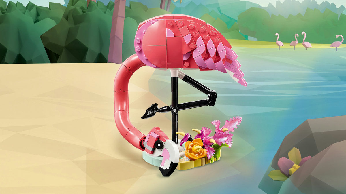 Внесете красотата и цвета на тропически остров в стаята си с тези 3 зашеметяващи диви животни! Гледайте как грациозно розово фламинго стои на изпъстрен с растения речен бряг, преди да отпие. За повече забавление с животни го престройте в красиво какаду, което може напълно да завърти главата си, или в очарователен аксолотъл. Какво ще построите? Изборът е ваш с този забавен комплект „3 в 1“.