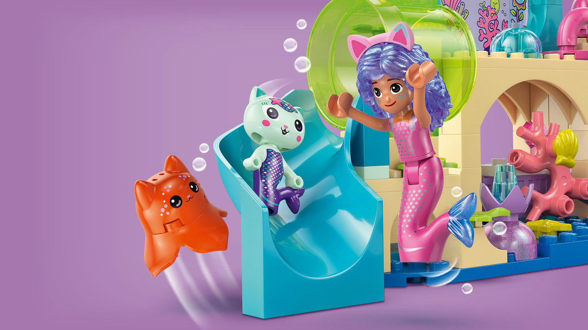 Гмурнете се в подводно приключение с Gabby, MerCat и многоцветни медузи! Gabby е облечена като русалка и е готова да изследва цветния аквариум, пълен с миди, растения и очарователен морски създания. Присъединете се към приятелите, докато се спускат по пързалката и плуват в гигантски балон, след което търсят миди и преместват корала, за да намерят скрит сандък със съкровища – точно като във филма!