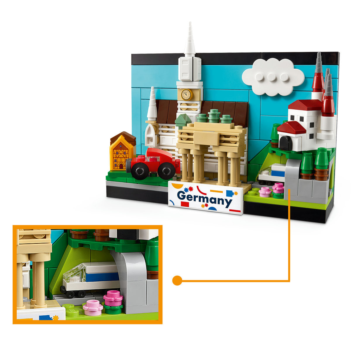 Развълнувайте любителите на пътуванията с този комплект за конструиране „Пощенска картичка от Германия“ от LEGO® (40954) за деца на възраст от 9 години нагоре. Пощенската 3D картичка показва емблематични забележителности, включително новото кметство в Мюнхен, Бранденбургската врата и замък, както и кола и влак. Стикери с надписи „Germany“ и „Deutschland“ могат да бъдат добавени към табелката с името, за да придадат допълнителен щрих на автентичност, когато се поставят на показ. Този сувенир от Германия е забавен подарък за рожден ден или пътуване за момчета, момичета и пътешественици. Комплектът съдържа 240 части.