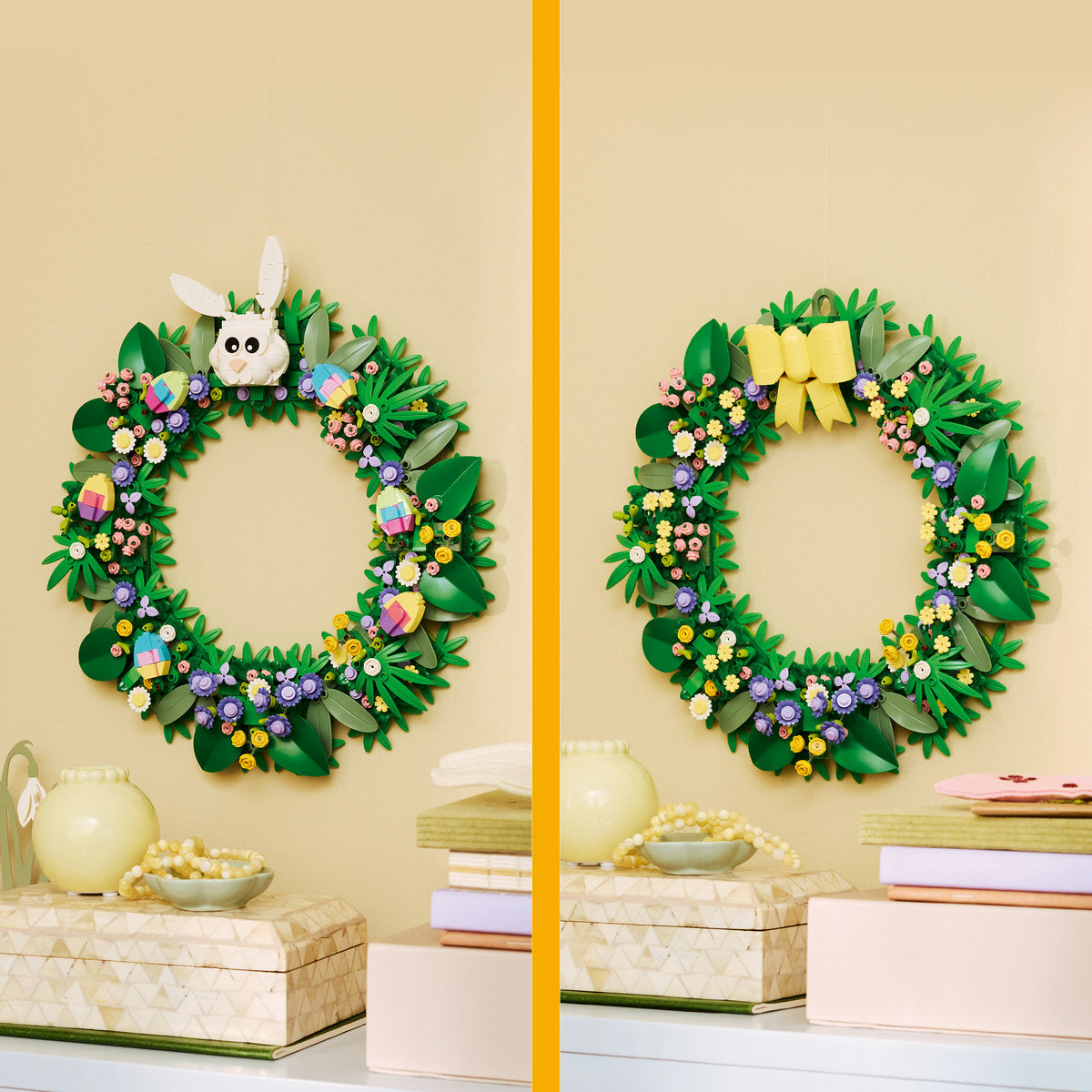 Изненадайте семейството или приятелите си на възраст от 12 години нагоре, които обичат великденски или декоративни венци, с този комплект за конструиране LEGO® Пролетен венец (40957). Насладете се на хитроумно сглобяване на 747-те части на комплекта, преди да го окачите на стената или да го поставите на масата като цветна домашна украса - и го използвайте отново всяка година. Пролетната и великденска украса включва жълта панделка, глава на зайче с подвижни ушички, 6 декорации от цветя и 6 великденски яйца, които помагат за отбелязването на празника. Това е идеалното великденско занимание за деца или тийнейджъри, които се радват на смяната на сезоните, или за възрастни, които обичат заниманията тип "Направи си сам".