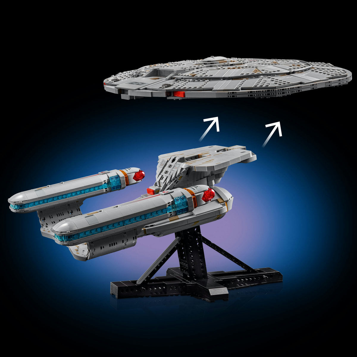 Впуснете се в творческо пътешествие със строителния комплект Star Trek: U.S.S. Enterprise NCC-1701-D™ за възрастни. Създайте детайлно копие на легендарния космически кораб с отделяща се командна чиния, отварящ се отсек за совалки, 2 минисовалки и ъглова стойка за показване. Този комплект включва и 9 минифигури с аксесоари и плочка за показване на минифигури с надписСтар Трек: Следващото поколение.
