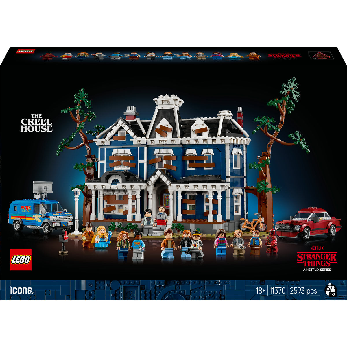 Влезте в Обърнатия свят с LEGO® Icons Странни неща: Къщата на семейство Крийл (11370), строителен комплект на миникъща за възрастни. Този призрачно детайлен модел на зловещото готическо имение включва колата на Стив, радиомикробуса WSQK и велосипеда на Уил. Къщата включва украсена фасада и се отваря отзад с достъп до антре, трапезария, дневна, спалните на Алис и Хенри, студения коридор на горния етаж и 2 тавански помещения.