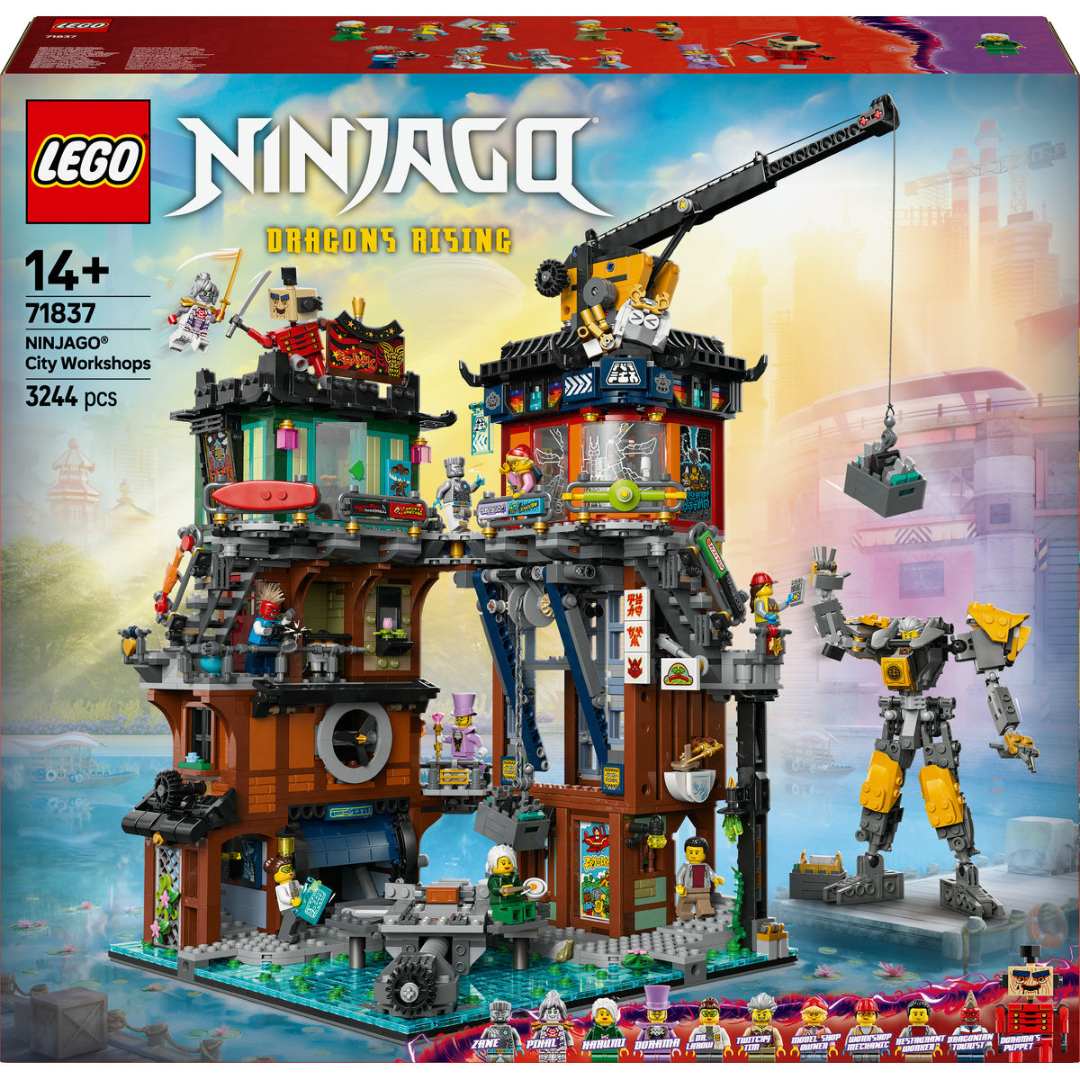 Допълнете колекцията си модели LEGO® NINJAGO® City с комплекта „Работилници в NINJAGO City“ с невероятни детайли и 4 етажа. Той има страхотни функции, включително подвижни апартаменти, магазини и ресторанти, 2 работещи крана и за първи път подвижен робот, който можете да персонализирате с броня и стикери. Включени са 10 минифигури за разиграване на епични бойни сцени между доброто и злото.